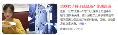 有網(wǎng)友提出疑問,這是同一個(gè)人嗎?衣服怎么會(huì)變沒了,或者說黑褲子變成了肉色的?隨后姑娘的親屬表示:“衣著是沒有問題的,監(jiān)控顯示的那一塊很黑,她彎著腰,紫外線照著她,把上衣和褲子都照成了白色” 。